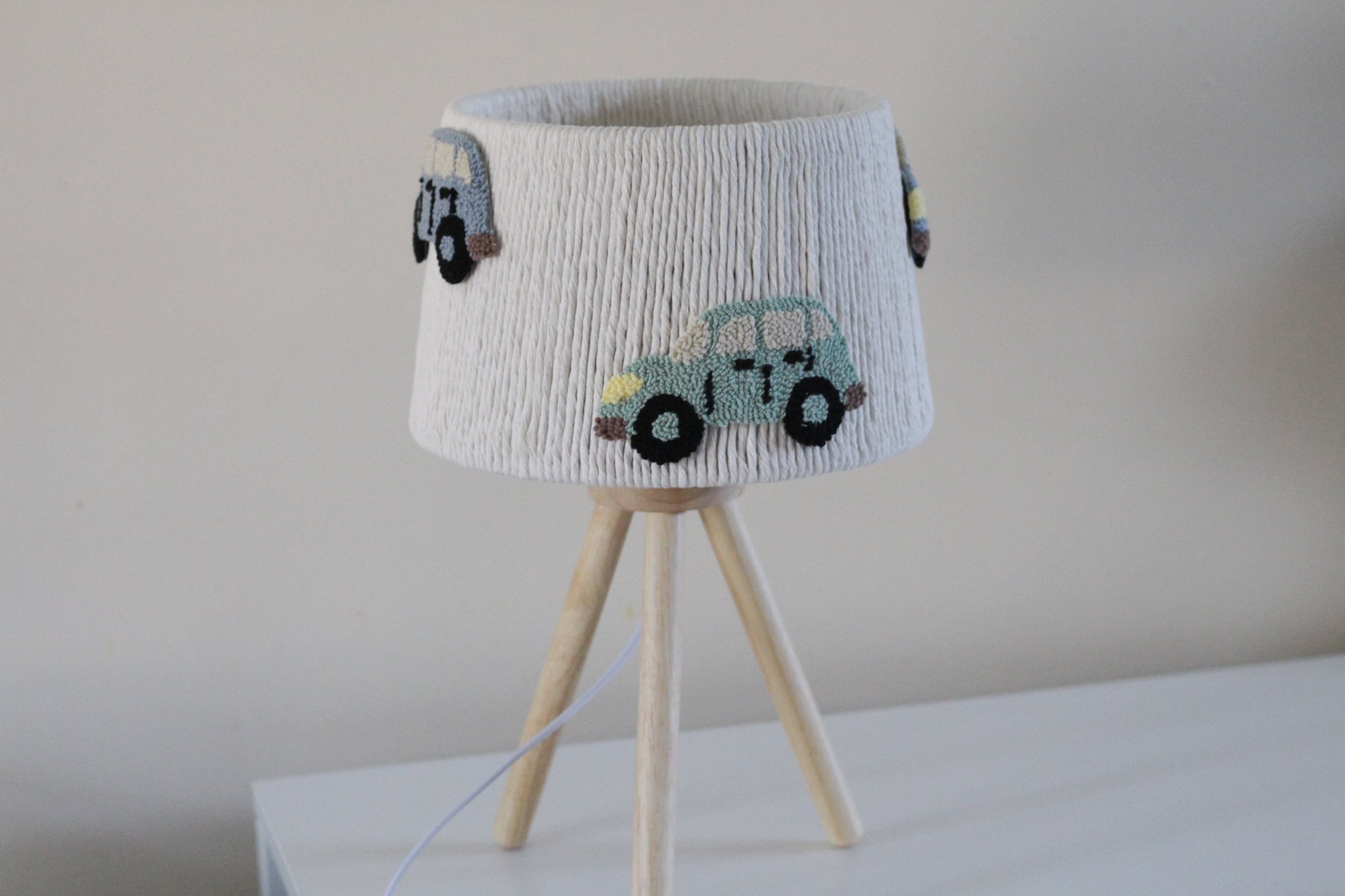 This lampshade is decorated with 4 cars and it comes with a wooden lamp base.