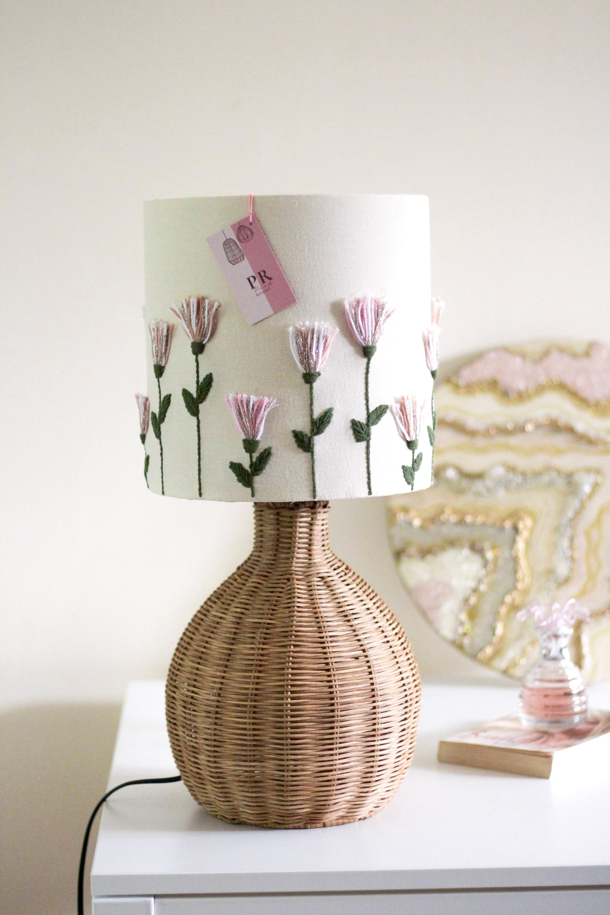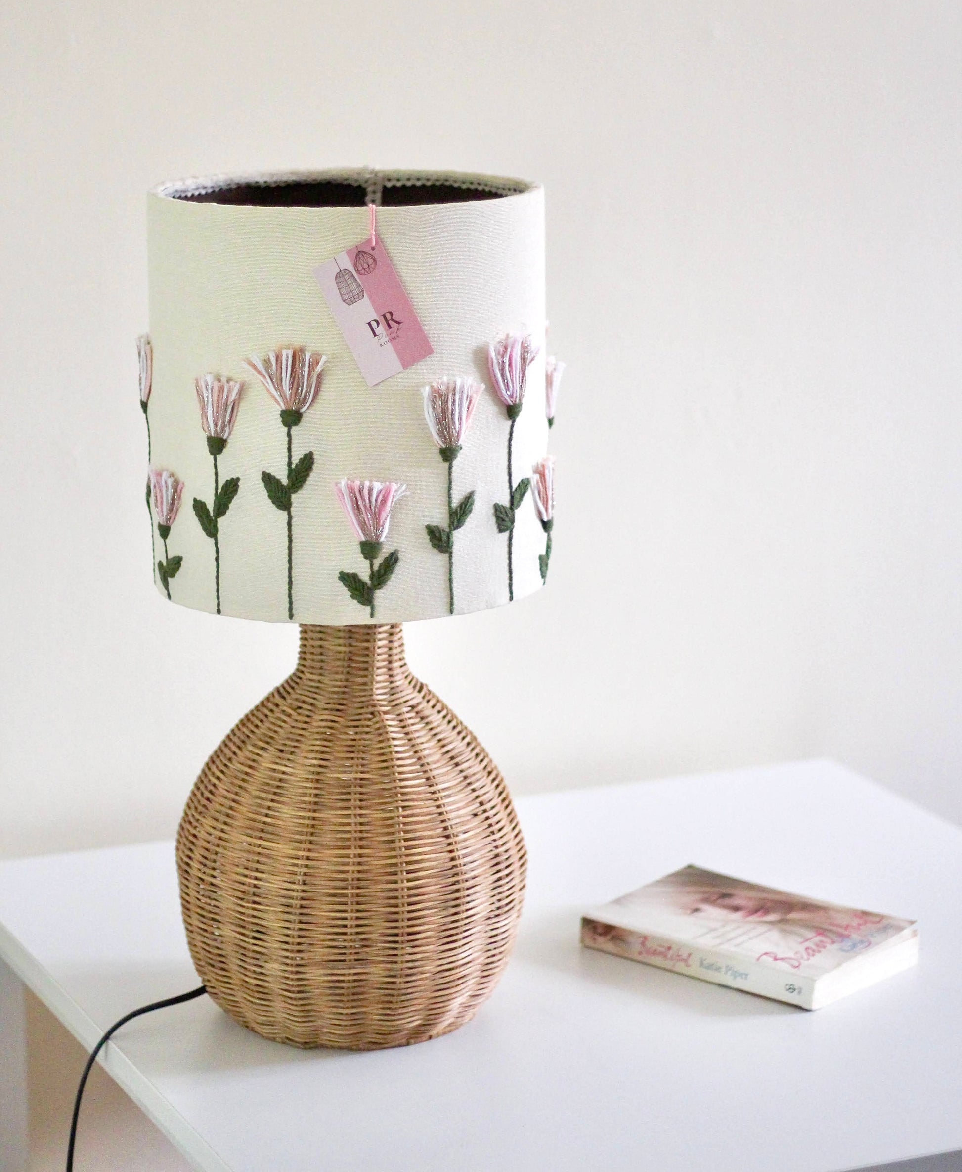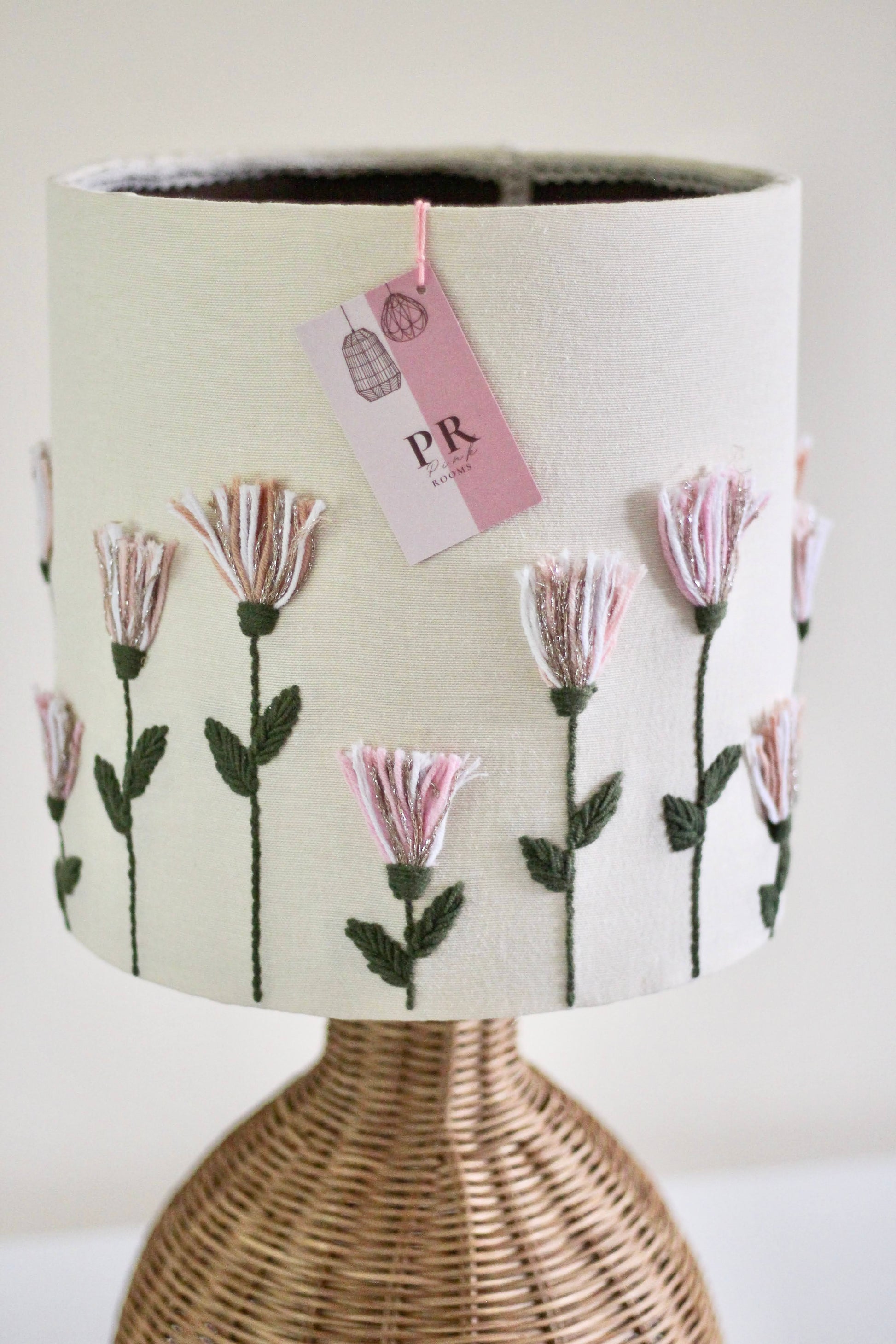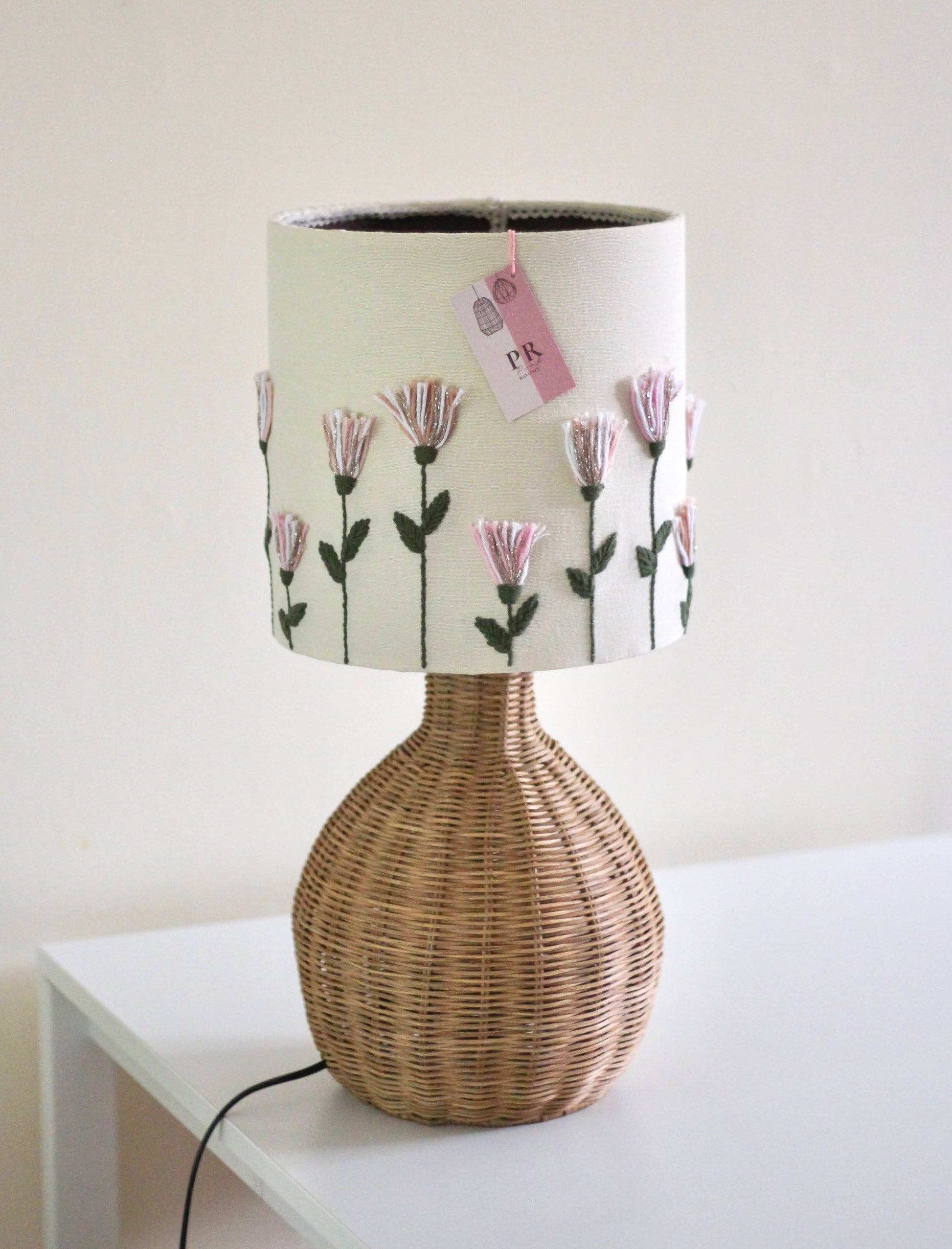 Delicate and detailed, this embroidered lampshade was carefully crafted by hand, making it a true labor of love. It is overflowing with embroidery and creative motifs that play over the pure-cotton fabrication.