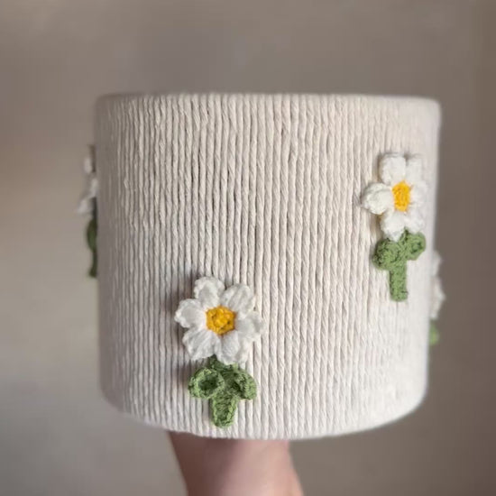 This handmade lampshade is handwoven with a macrame cord and decorated with SMALL FLOWERS.