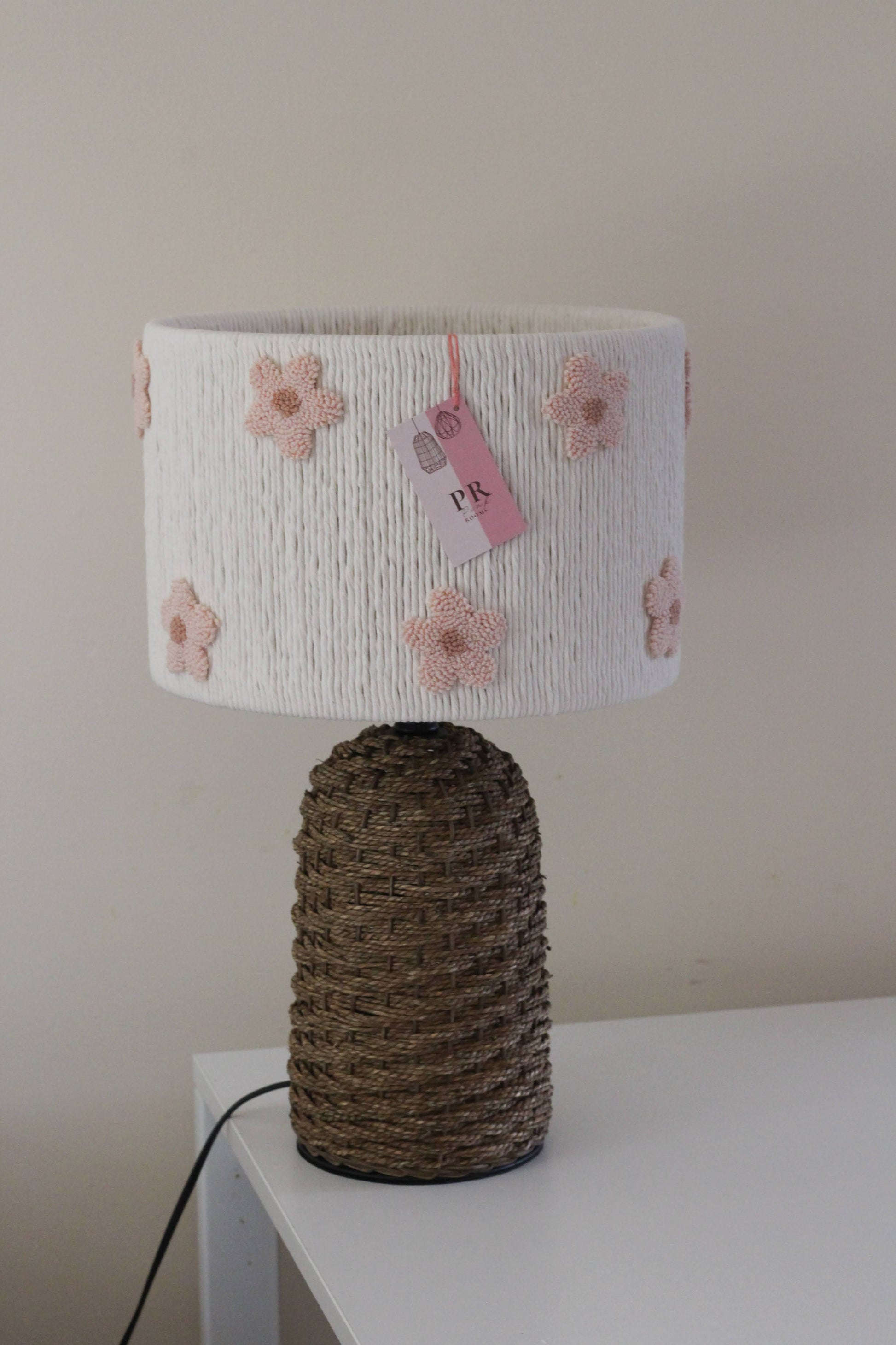 This beautiful handmade lamp with rattan base is handwoven with a macrame cord decorated with peach coloured daisies.