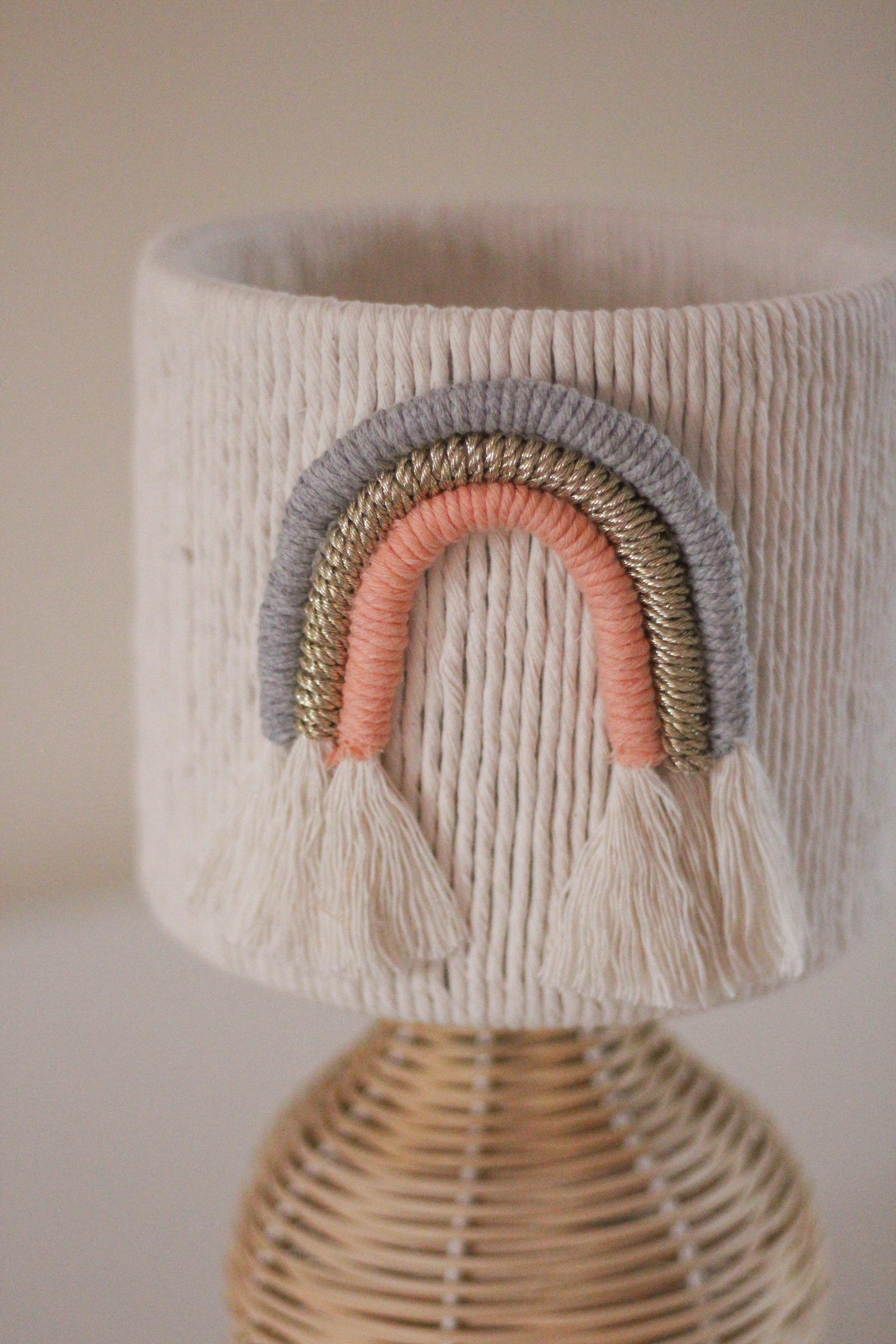 This handmade lamp is handwoven with a macrame cord and decorated with 2 rainbows.
