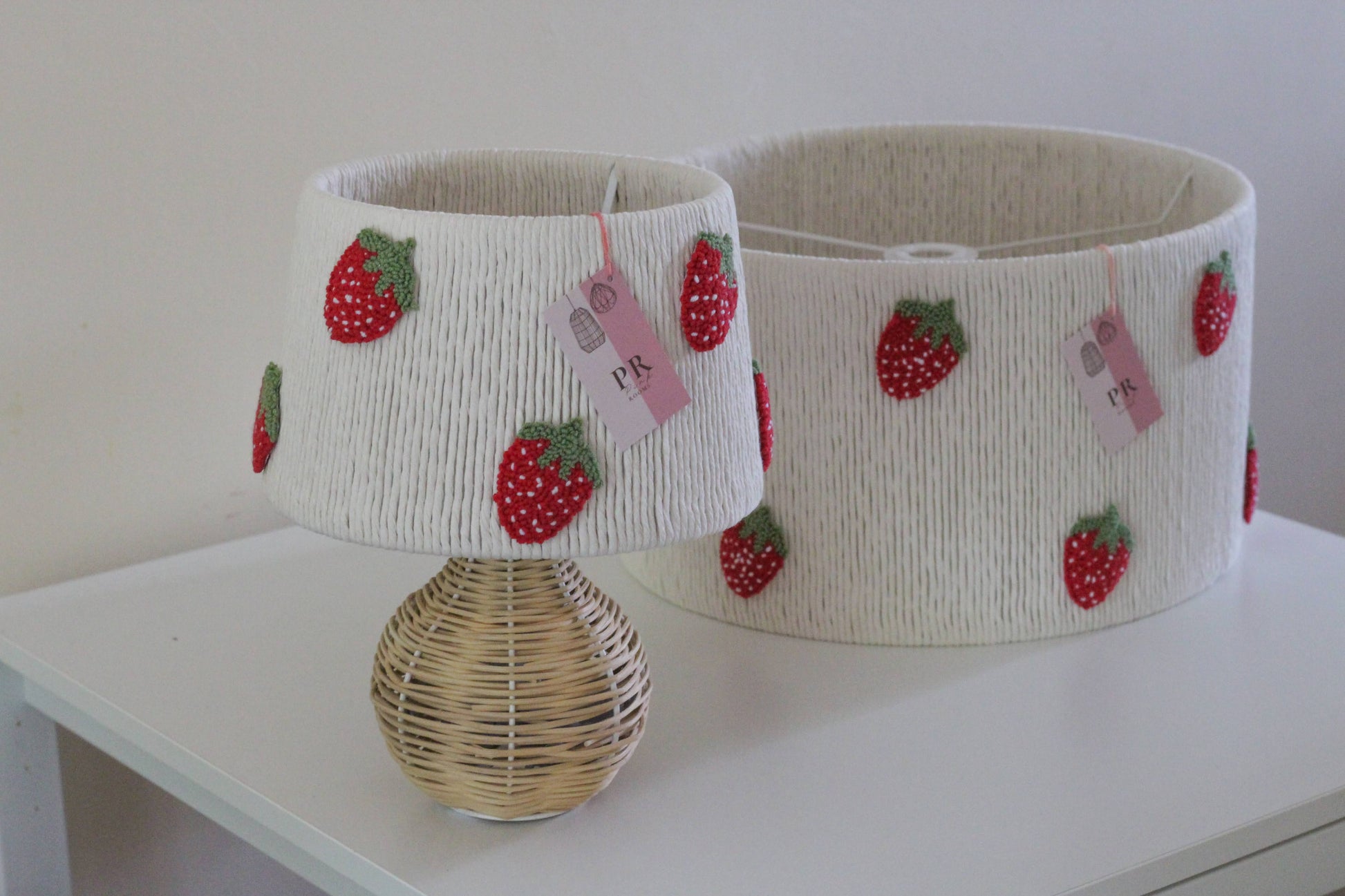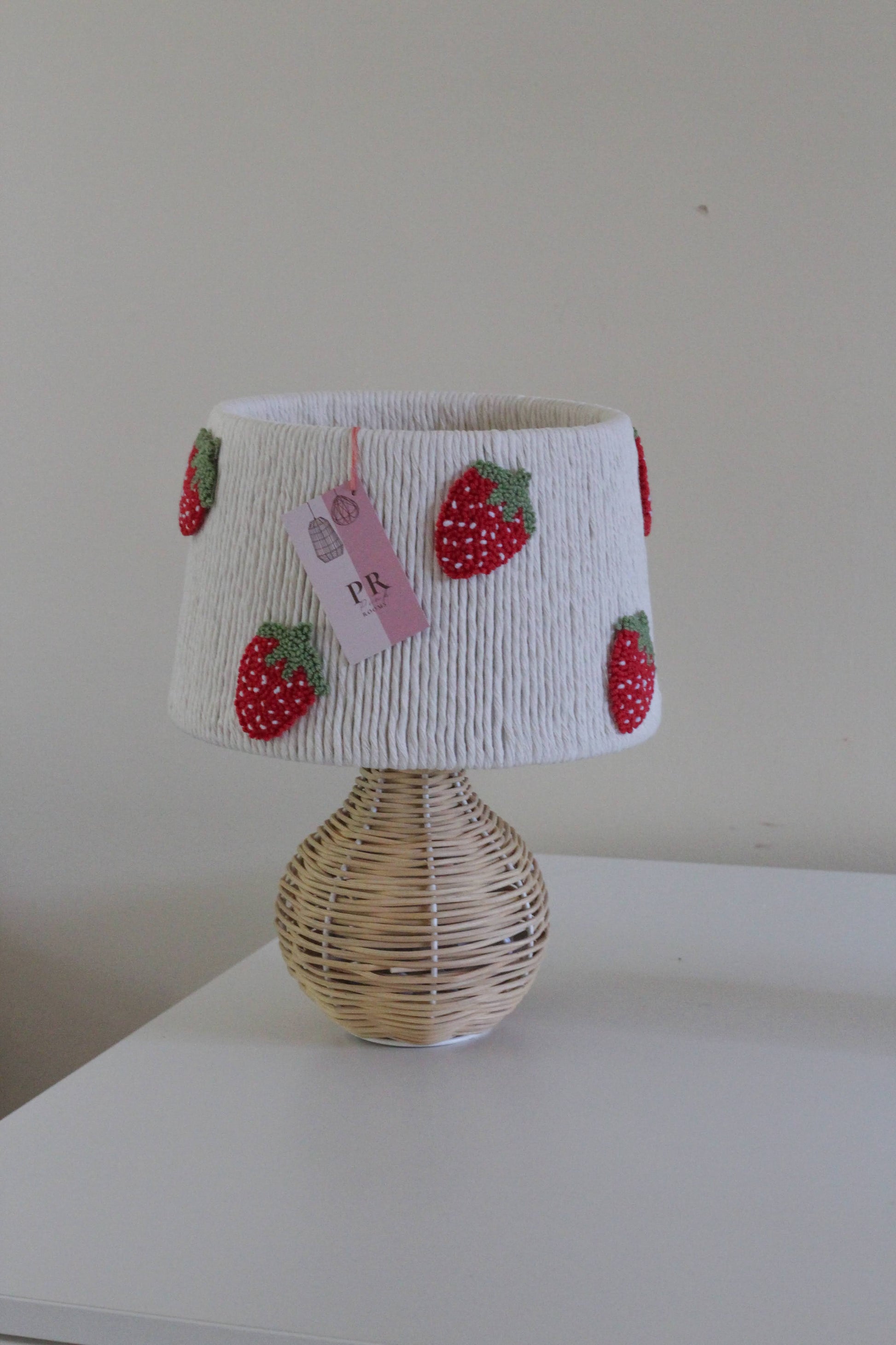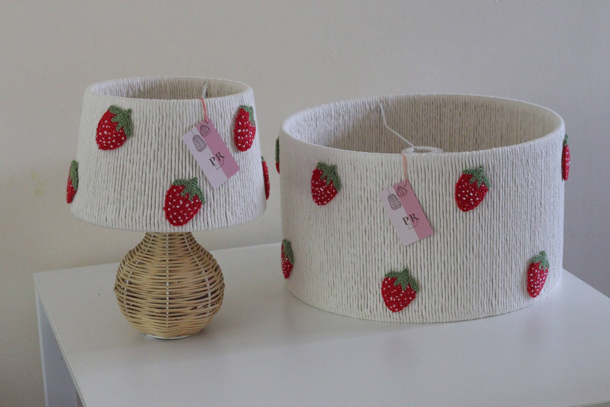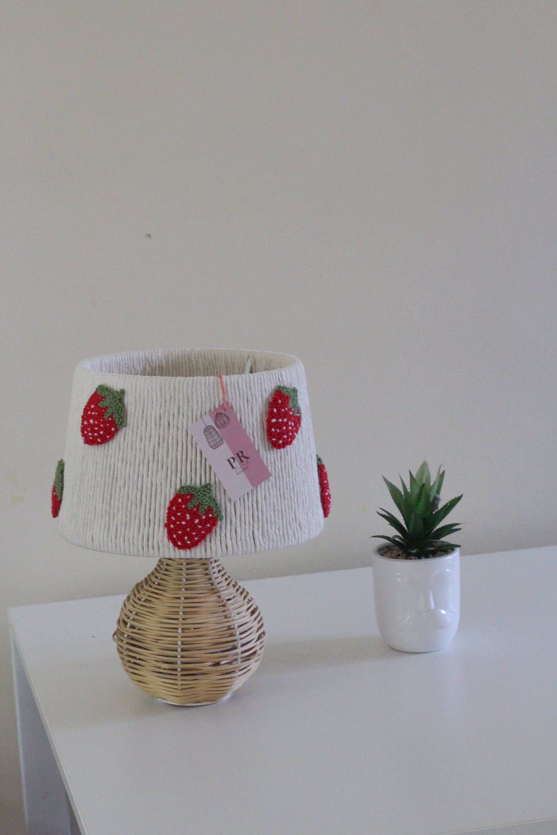 This handmade lampshade is handwoven with a macrame cord and decorated with strawberries.