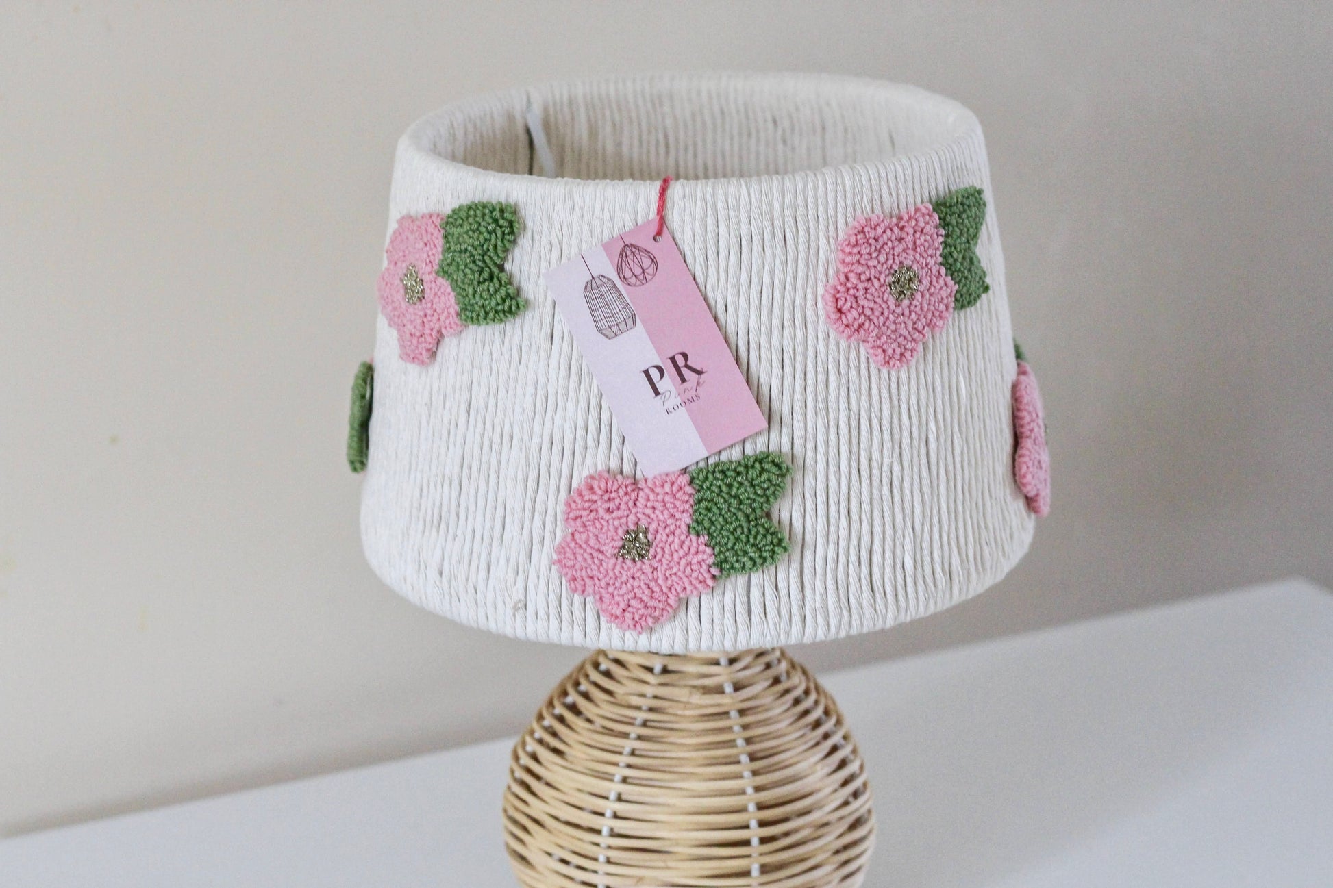 This handmade lampshade is handwoven with a macrame cord and decorated with flowers.